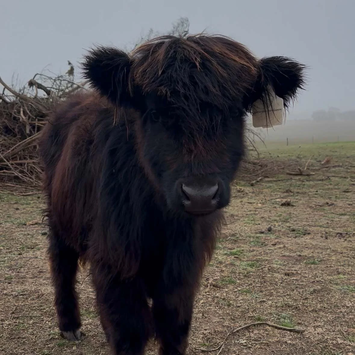 Bobby is a sweet, mellow black Highland steer with a quiet nature. While a little shy, he is friendly and can be hand-fed in the paddock. Bobby would suit a hobby farm or as a gentle paddock pet — an easy-going, smaller steer who prefers to hang back and take things at his own pace.