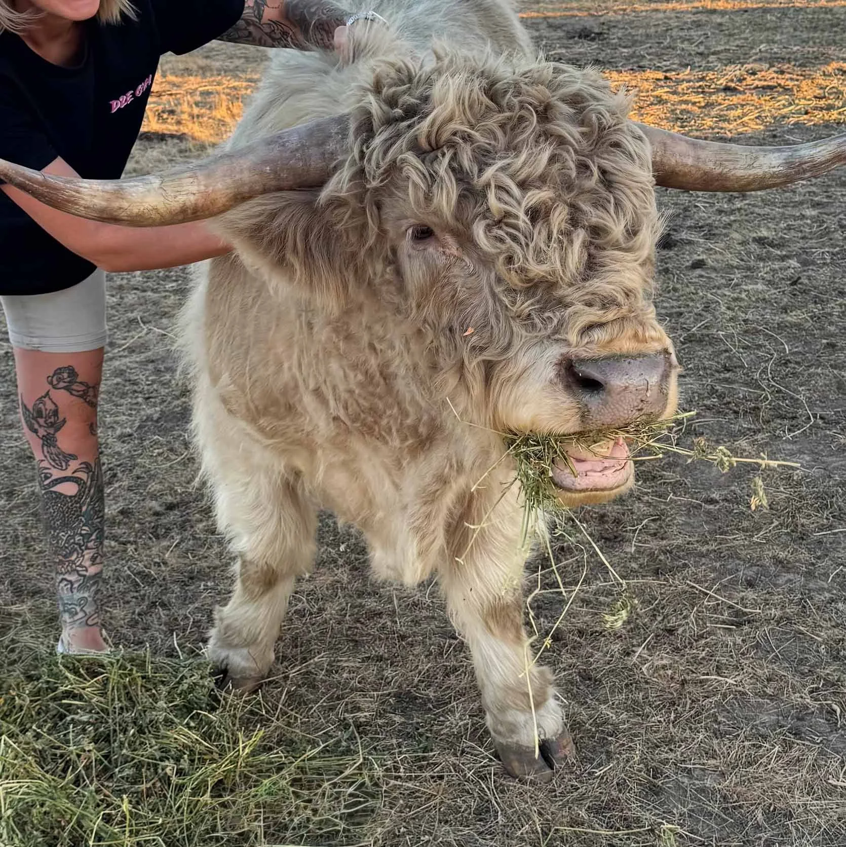 Graham is a beautiful small-framed white Highland bull with a gentle nature and proven track record as a breeder. He is friendly, enjoys being hand-fed, and loves a good scratch. Graham is a sought-after colour in Highland cattle, making him an excellent addition to a breeding herd or as a calm paddock companion on a lifestyle property.
